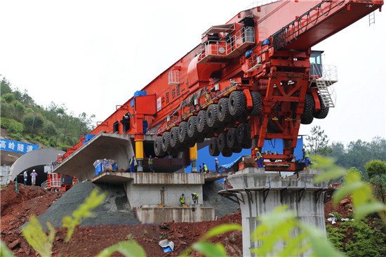 6月2日上午9時46分,由通聯(lián)科技生產的被稱為“高鐵神機”的TTYJA900型運架一體機,在順利穿過中鐵二十一局昌贛客專12標管段第一座隧道--竹高嶺隧道后,成功架設燕子巖特大橋第一孔箱梁。